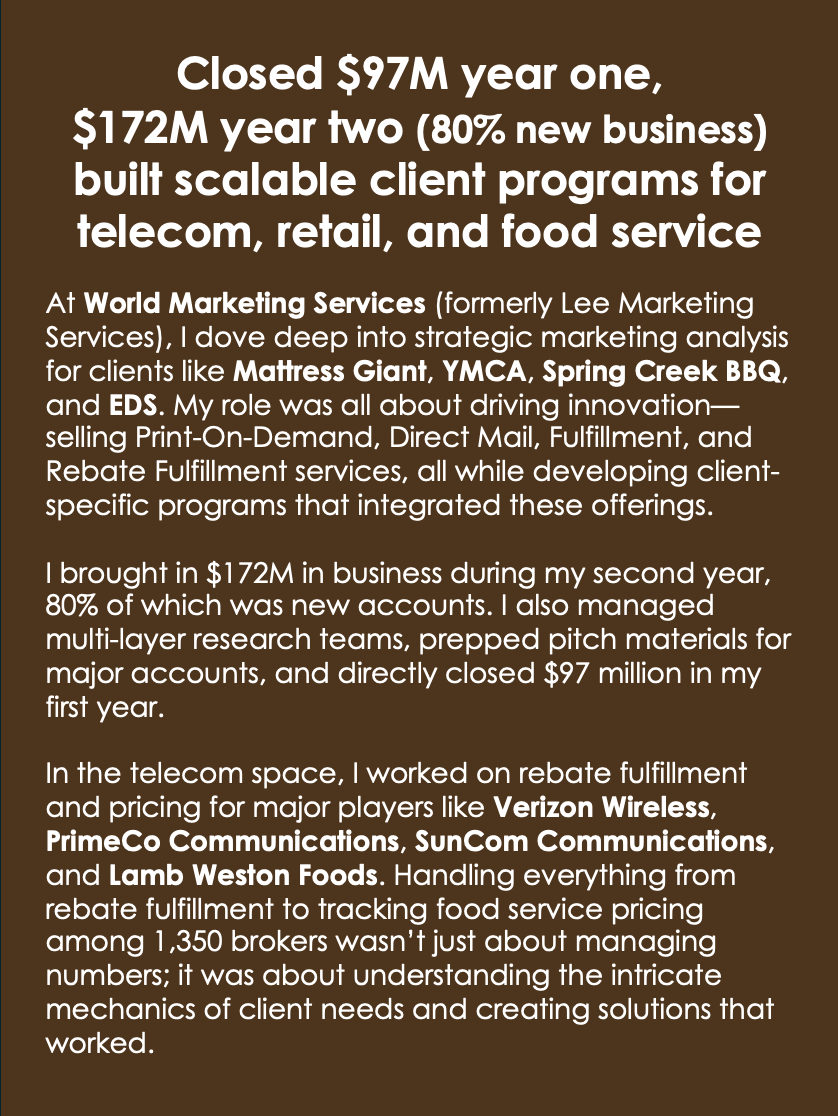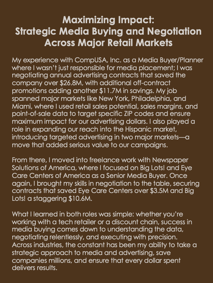 Same playbook across categories — data first, ruthless negotiation, flawless execution — delivering $52.6M in savings. Decisions start by looking at the numbers. This is how I learned to read numbers in a big way. You can read a deep dive into my media buying days — a letter of recommendation, and a look at an entire company’s sales data broken down (DC, Baltimore, Norfolk, Richmond). Sales rankings. ROI. Market summaries. Competitors. And, most importantly, the POS and retail sales data that let us track consumers by ZIP code.