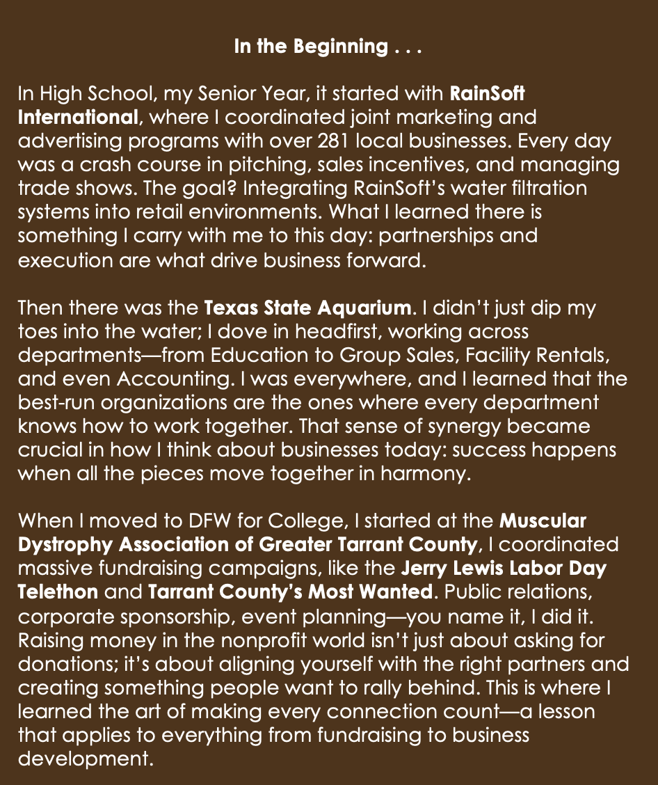 Six Flags Over Texas – Managed guest relations, media, and operations in a high-volume theme park; learned precision under pressure.